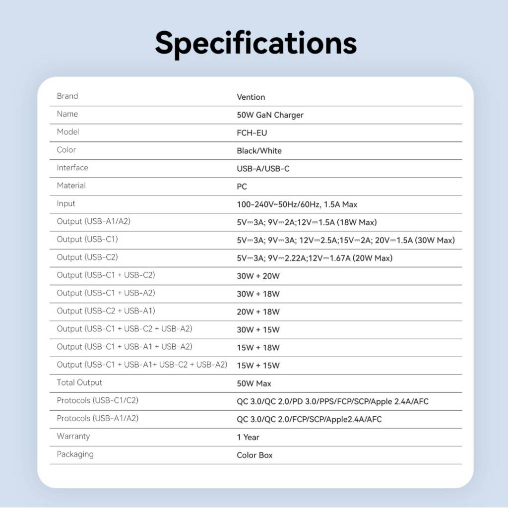 Salida (USB-C1 + USB-A1 + USB-C2 + USB-A2): 15 W + 15 W