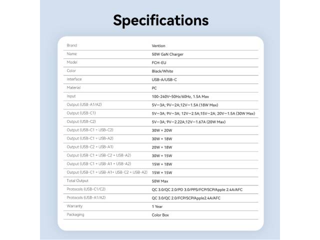 Salida (USB-C1): 5 V / 3 A; 9 V / 3 A; 12 V / 2,5 A; 15 V / 2 A; 20 V / 1,5 A (30 W máx.)