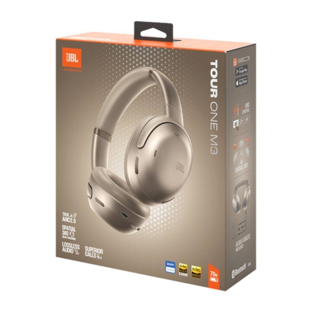 Auriculares over-ear premium JBL Tour One M3 Smart Tx con sonido envolvente de alta resolución y cancelación de ruido adaptativa True Adaptive Noise Cancelling 2.0 que se ajusta automáticamente al entorno. Disfrutá de audio claro y equilibrado con JBL Spatial 360 y conectividad Bluetooth 5.3 para música y llamadas sin cables. Incluyen transmisor JBL Smart Tx para conectarte fácilmente a cualquier fuente de audio (incluyendo dispositivos sin Bluetooth) y compartir sonido vía Auracast™. Hasta 70 h de batería (40 h con ANC activado), micrófonos integrados para llamadas nítidas y diseño cómodo para uso diario.