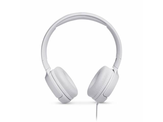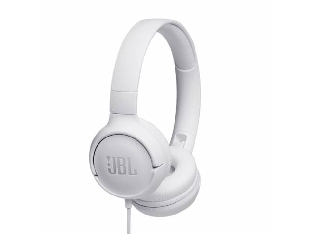 Auriculares JBL Tune 500 con cable para un sonido potente y claro sin necesidad de batería. Ofrecen JBL Pure Bass Sound con graves profundos para música, videos y llamadas. Incluyen micrófono integrado y control de un solo botón para gestionar audio y llamadas fácilmente. Diseño liviano, cómodo y plegable, con cable plano antienredos y conexión jack 3.5 mm, ideal para uso diario.