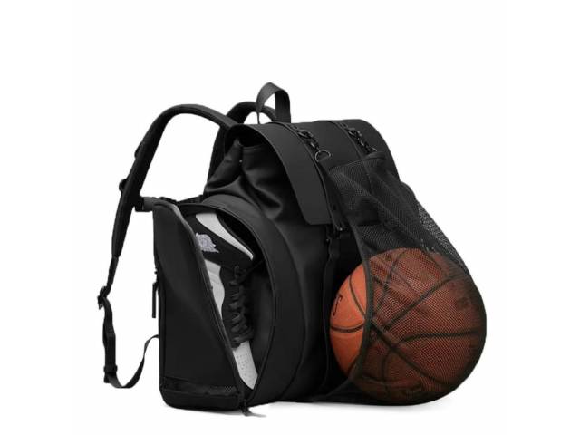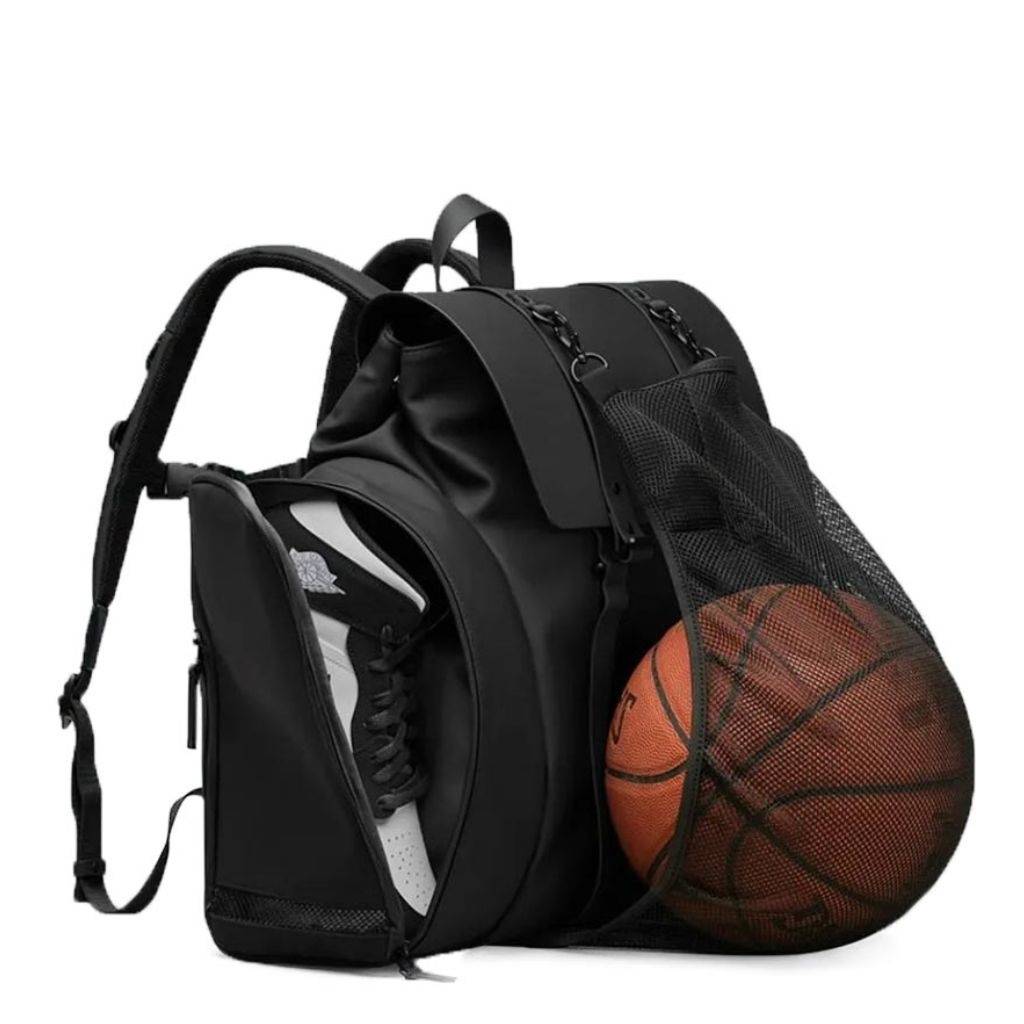 Un soporte de malla retráctil, ubicado en un compartimento oculto en la parte inferior, te permite sujetar tu pelota de baloncesto fuera de la mochila.